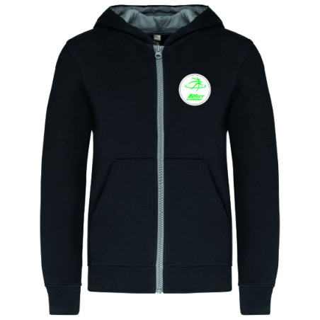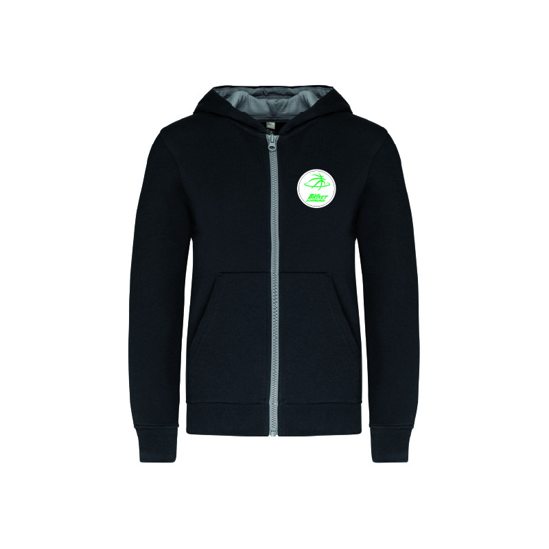 80% coton / 20% polyester. Coton peigné. Molleton gratté. Bord-côte bas de manches et de vêtement. Capuche doublée et contrastée. Zip contrasté. Passe-fils écouteurs dans la poche kangourou et encolur